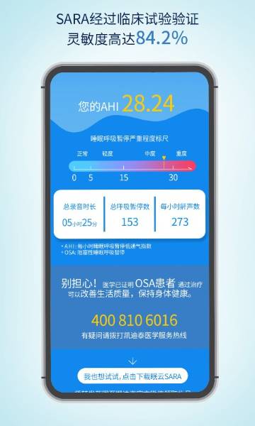 - 风险评估算法模型:特有的算法模型能够评估您罹患呼吸暂停综合征的风险等级,为您提供更加个性化的建议。
