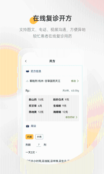 通过这款应用,医生们可以更便捷地管理患者,提供健康咨询,进行在线复诊并开具药物,以及享受中药配送服务,从而实现专业、高效、便捷的中医药服务体验。目前,已有超过14万名中医师加入了甘草医生平台,为超过500万人次患者提供了服务,服务网络遍布全国32个省级行政区和363个市。 甘草医生App的功能丰富多样,旨在让医生的工作更加省心省力。患者管理功能允许医生在线自定义接诊方式和时段,合理规划工作时间。患者档案可云收录,支持随时查看和编辑。