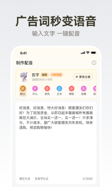 - 便捷操作与个性化定制:一键文字转语音合成,让您轻松制作广告音频;海量背景音乐供您选择,实现个性化定制。