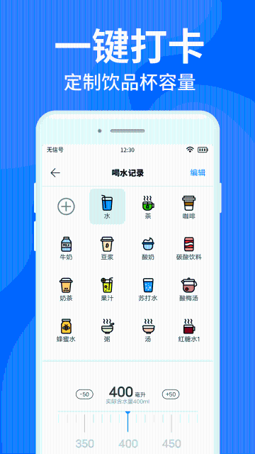 【一键打卡,记录更便捷】为了让您的喝水记录更加便捷,我们特别设计了一键打卡功能。您无需手动输入喝水信息,只需轻轻一点,即可记录您所喝的饮品和饮水量。同时,您还可以自定义设置常用饮品和杯量,让记录变得更加简单。