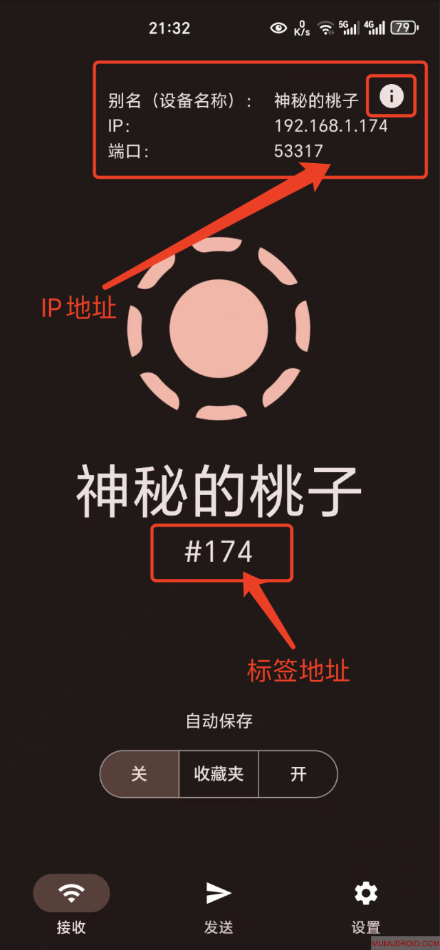 3、如何查看接收设备的地址呢?以安卓客户端截图为例如下: